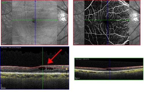 Die Gefäßdarstellung oben rechts im Bild zeigt einzelne Mikroaneurysmata, die wie kleine helle Punkte neben den Gefäßen zu erkennen sind und zusammen mit dem zystoiden Ödem zum Krankheitsbild einer nicht-proliferativen diabetischen Netzhauterkrankung (Retinopathie) zählen. Neben der Einstellung des Zuckerspiegels kann hier eine Behandlung mit einer intravitrealen Medikamenteneingabe (IVOM) erwogen werden. Diese hat die früher durchgeführte Laserbehandlung bei dieser Indikation heute zu weiten Teilen verdrängt und hat den Vorteil, dass keine thermischen Gewebeschäden entstehen.