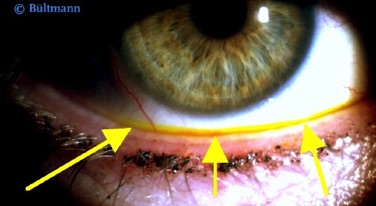 Anfärbung des Tränenfilms mittels Fluoreszein. Der wasser- lösliche und harmlose Farbtoff wird besonders gut bei blauem Licht sichtbar und ermöglicht eine Tränenfilm-Diagnostik.